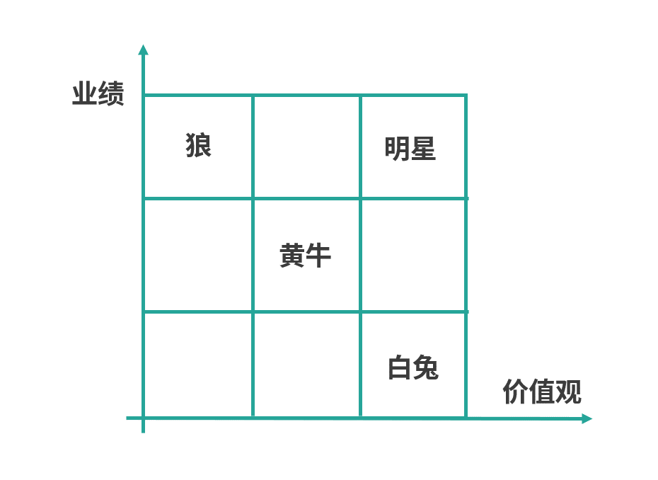 白兔看起来人畜无害,繁殖能力极强,大公司里最容易存在的就是“白兔”(不干活的好人)。他们目标和价值观认同度较高,但是业绩长期拖后腿。每一家公司都有这样的人,看着勤勤恳恳,但却拿不到任何结果,如果你纵容白兔的存在,那么长久下去,很容易滋生一群白兔磨洋工,针对这类员工,你前期可以给予改正的机会,如果依旧没有改善,应该毫不犹豫将其送走。